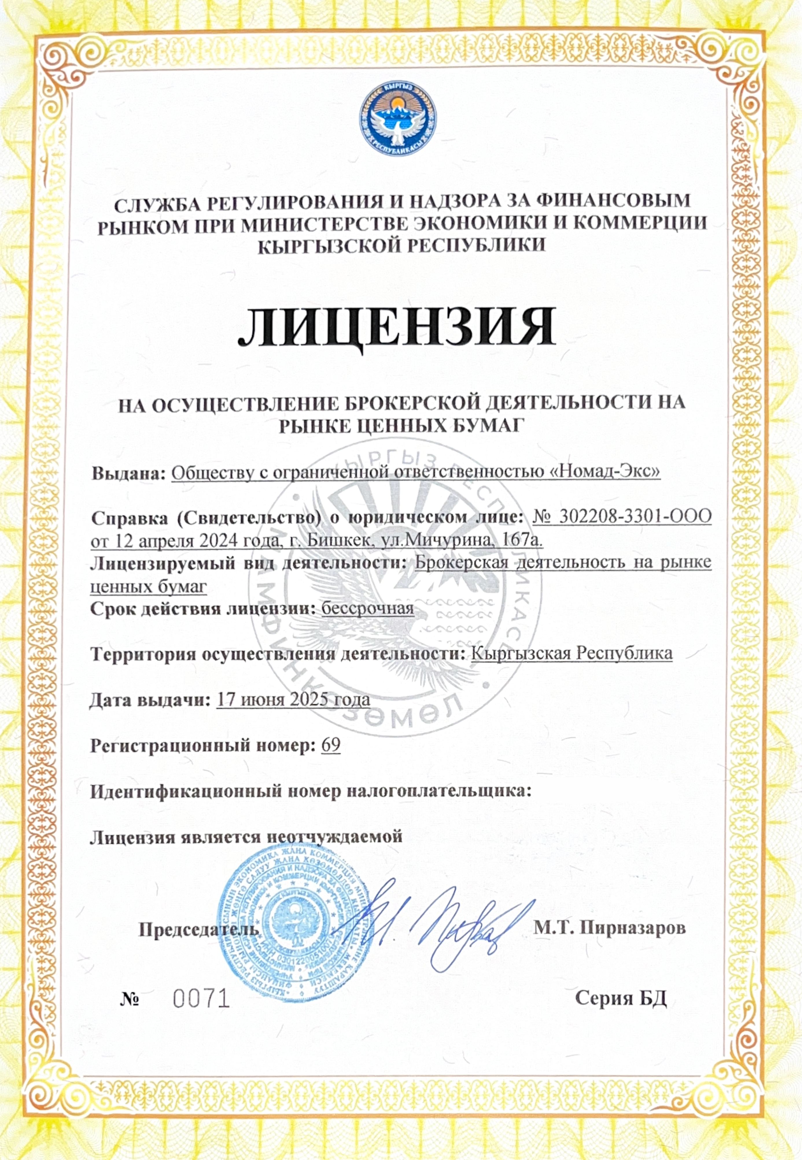 Орган выдачи: Служба регулирования и надзора за финансовым рынком